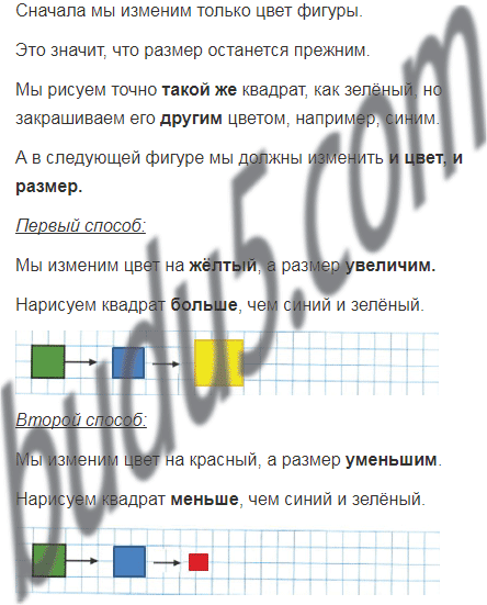 Продолжи рисунок: сначала измени только цвет фигуры, а затем цвет и размер.